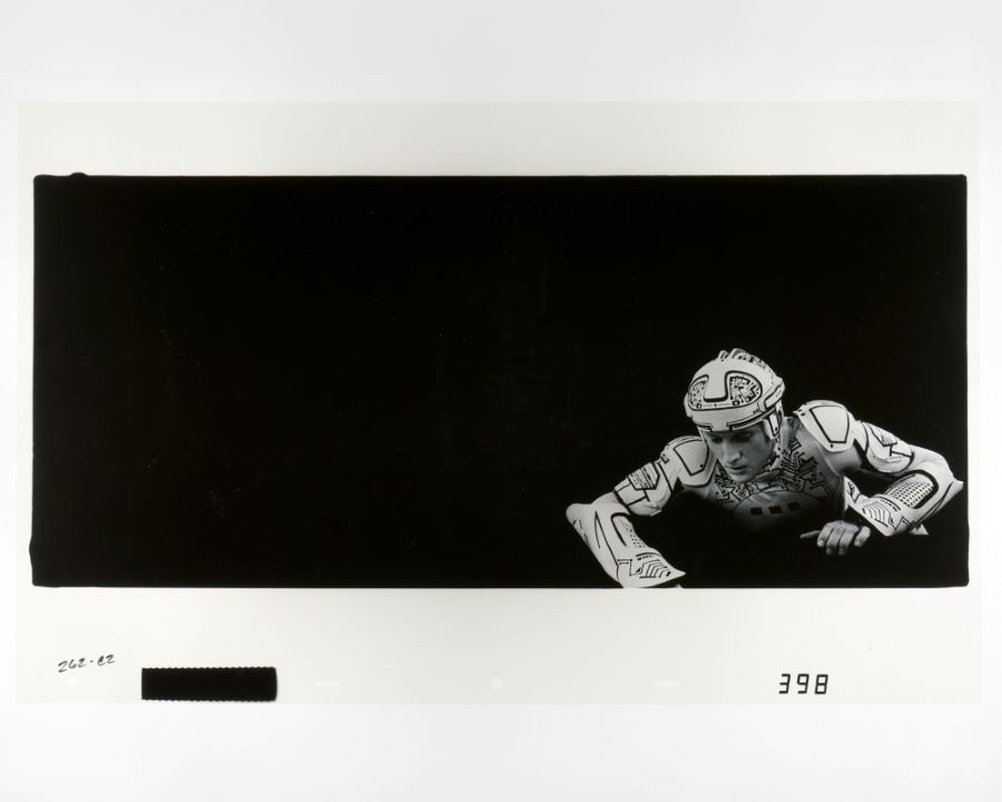 An Ektachrome continuous-tone transparency cel from the Walt Disney Studios live action film TRON (1982). Featuring Bruce Boxleitner as Tron as he’s enjoying some cool water, the Ektachrome cel was created at the studio and used during the production of the special effects sequences in the film. The groundbreaking film predated modern day computer animation and effects, requiring the unique lighting effects to be hand created frame by frame. This painstaking process was only used for TRON, making the film's effects artwork a special piece of movie history. Measuring 12.5"x20" overall and with the character image measuring 5"x8", the transparency cel is in very good condition with light creasing, minor surface scratches, and a "liquid-like" residue across the surface.