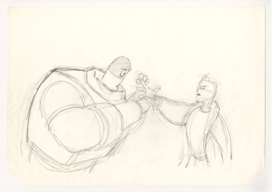 A development drawing from the Warner Bros. Studios animated film "Osmosis Jones" (2001). Featuring a loose sketch of Drix and Osmosis, the graphite drawing was created at the studio and used during the animation process. Measuring 11.5"x16.5" overall, with the character image measuring 7.5"x13.5", the drawing is in very good condition with corners clipped, minor edge wear and discoloration.